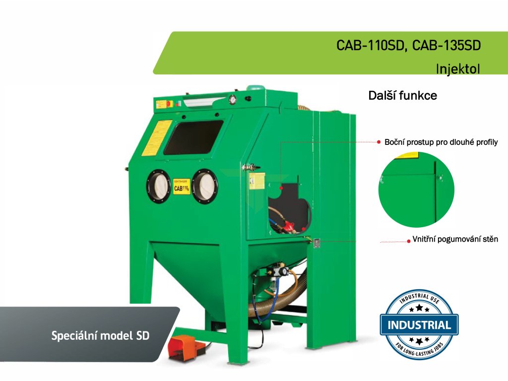 Kabinová pískovačka SD disponuje vnitřním pogumováním pro tryskání s agresivními abrazivy a božním prostupem s gumovou zástěnou pro tryskání dlouhých profilů.Výhoda injektorové kabiny je nenáročnost na stlačený vzduchu oproti kabinám tlakovým a možnost pracovat už od tlaku 3 bar. |
