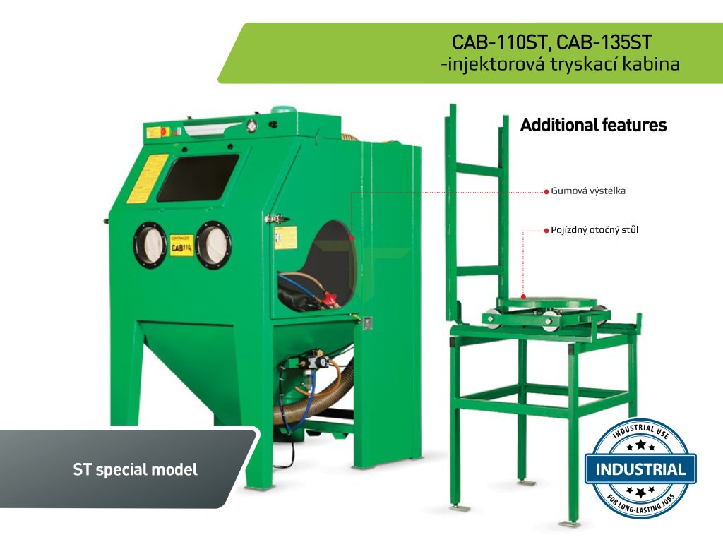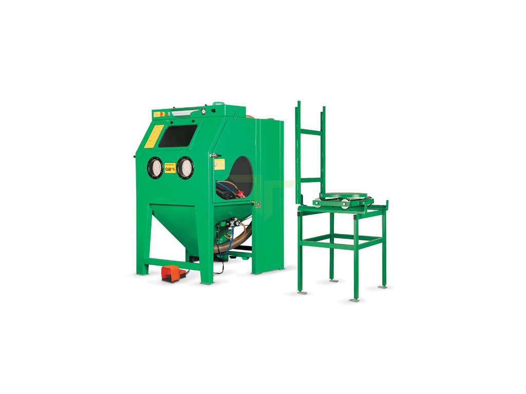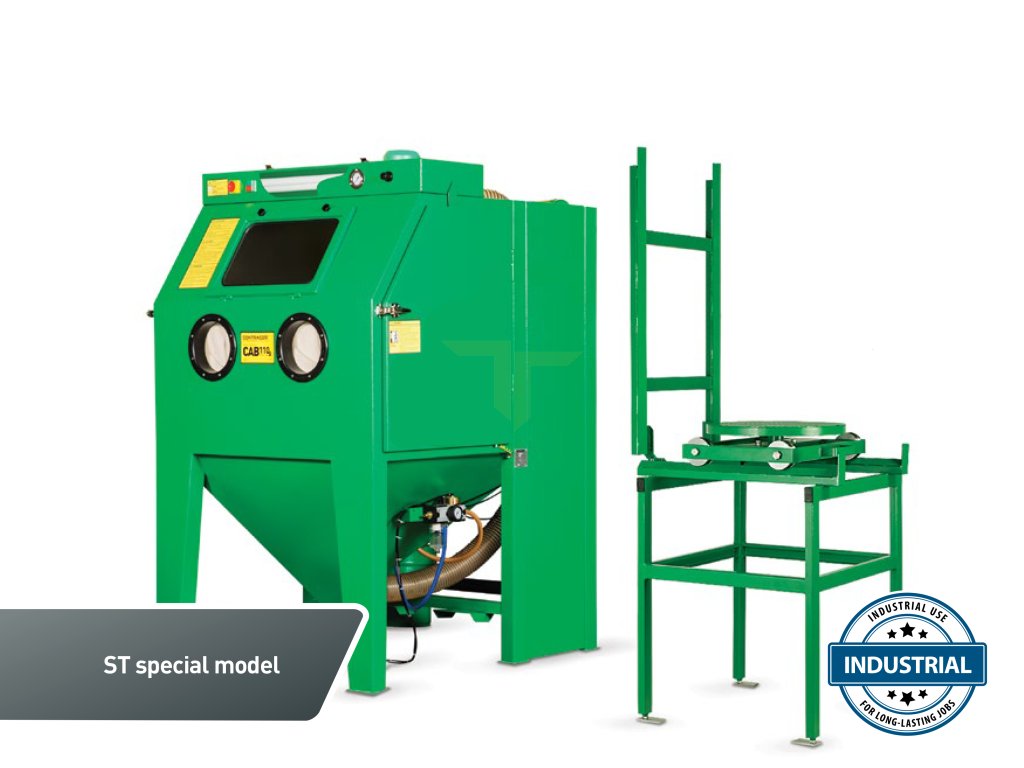 Pískovací kabina ST je ideáním řešením pro tryskání s těžkými a neforemnými díly. Otočný talíř poskytuje bezpečný a pohodlný pohyb v kabinách a může výrazně zvýšit produktivitu. Je vybavena otočným stolem TTM-500 s vozíkem a kolejnicovým systémem. Součástí je také gumová výstelka pro ochranu stěn kabiny.Výhoda injektorové kabiny je nenáročnost na stlačený vzduchu oproti kabinám tlakovým a možnost pracovat už od tlaku 3 bar. |