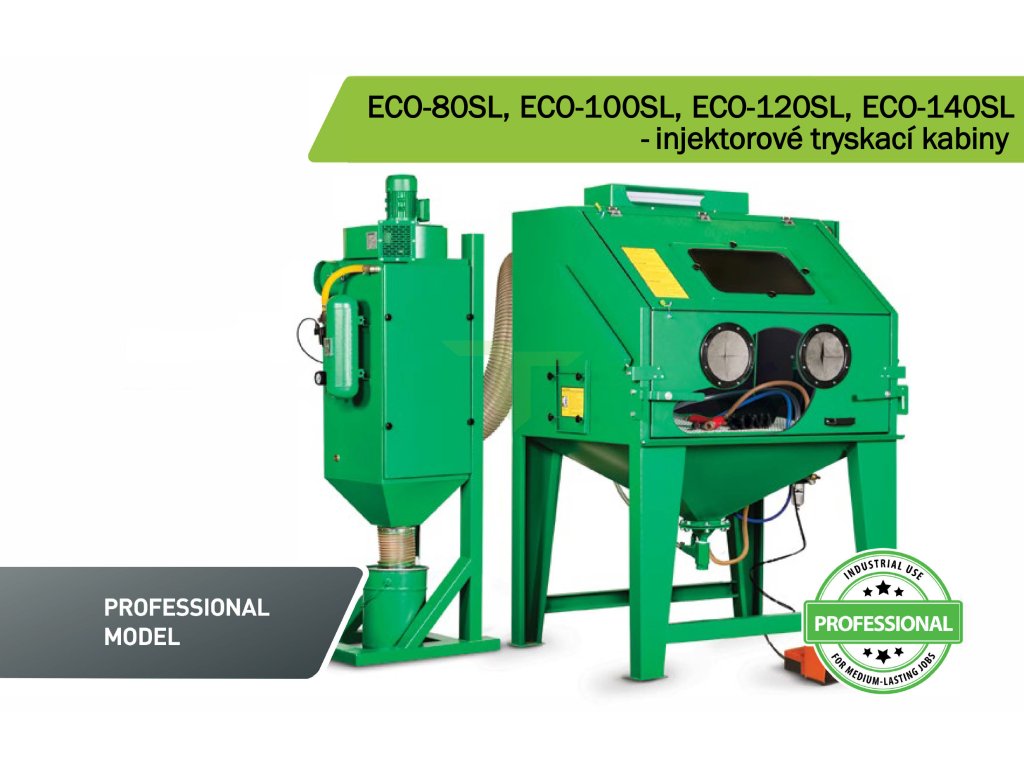 Profesionální tryskací kabina Contracor ECO-80SL s automatickým oklepovým odsáváním pro tryskání za sucha. Má ergonomickou a plně svařovanou konstrukci pro snadnou manipulaci s díly a ideální polohou pro tryskání ve stoje či vsedě.