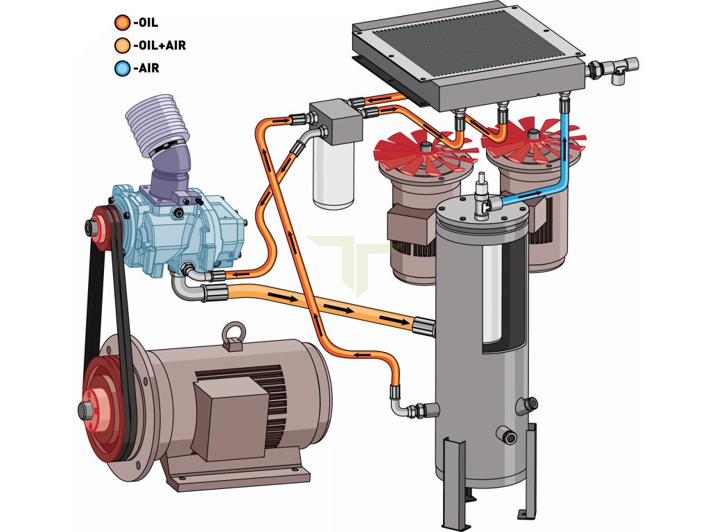 - Použitím účinného systému separace oleje se dosáhne zbytkového obsahu oleje ve stlačeném vzduchu maximálně 3 mg / m3.
