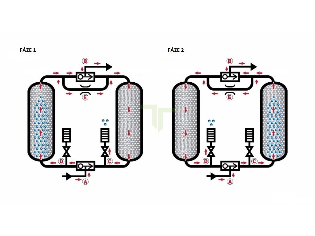 Adsorpční sušičky Comprag obsahují dva stojaté sloupce naplněné adsorpčním materiálem,řídící jednotku s ukazatelem tlaku, mechanických částí a potřebných filtrů. K adsorpci pod tlakem dochází v prvním sloupci, zatímco druhý sloupec regeneruje za použití části již vysušeného vzduchu, kterým je protlačován a odvětráván do okolí.